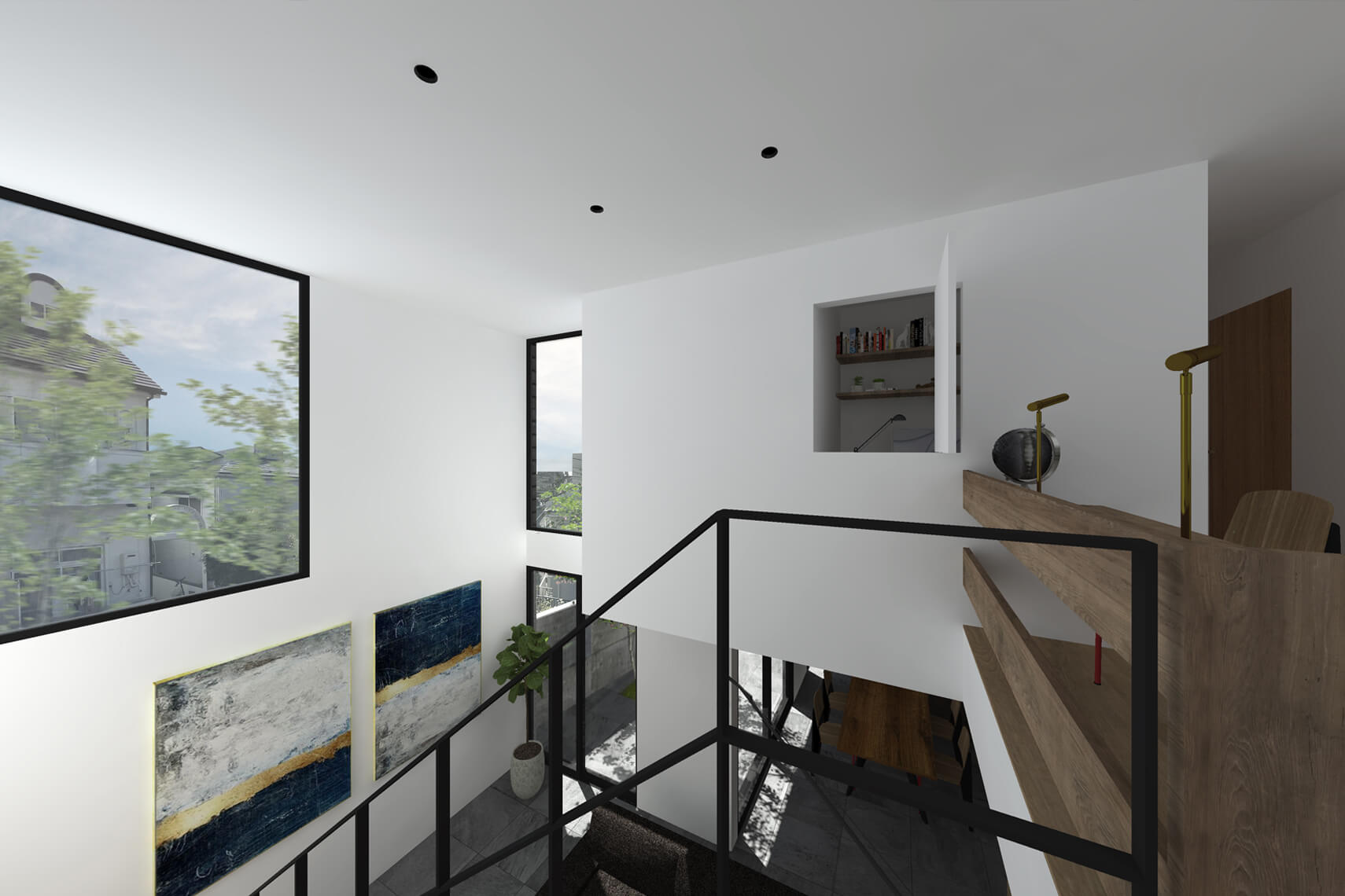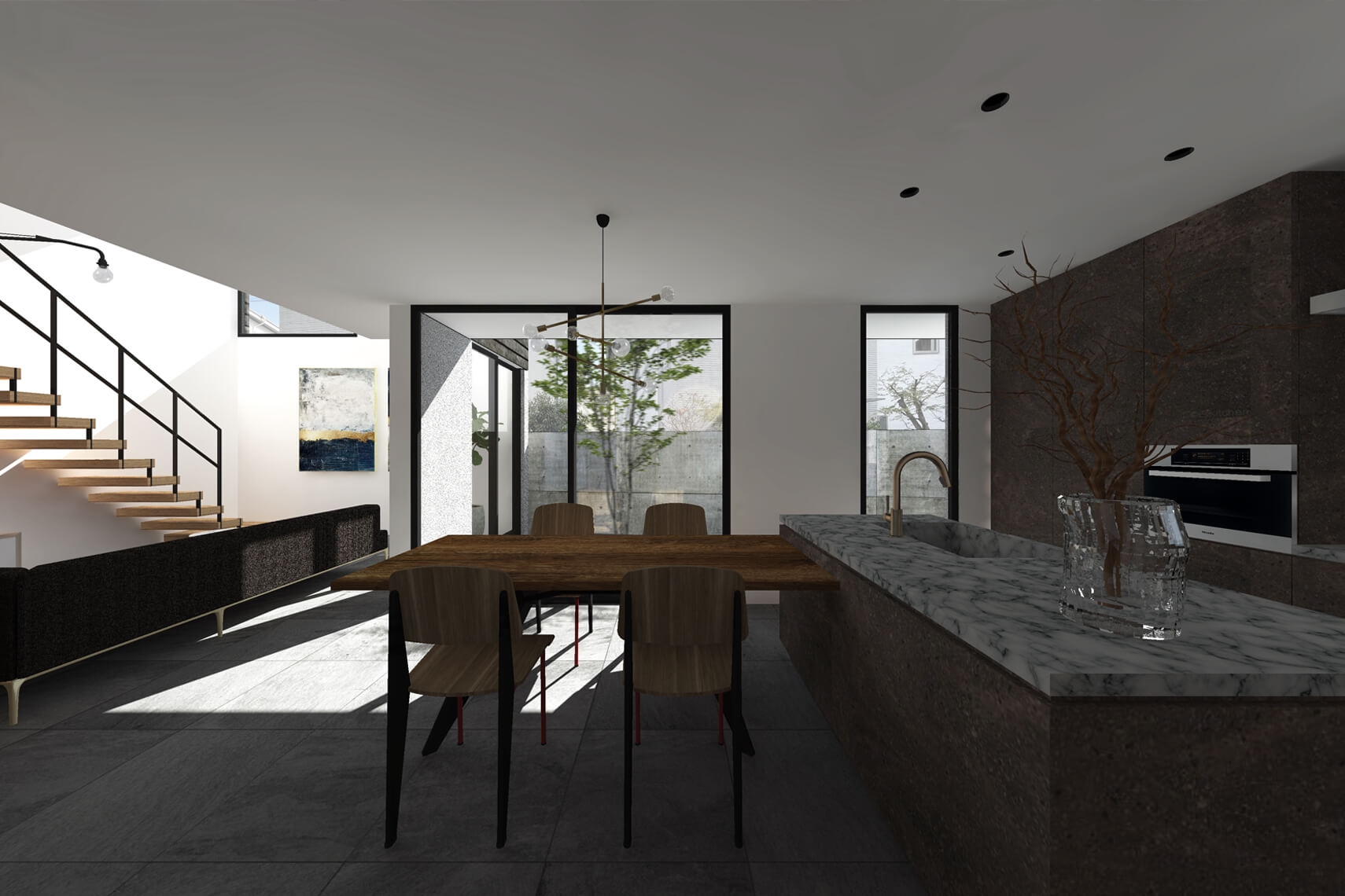 周辺の住宅の位置やセキュリティを考慮し、開口部を制限するため、敷地を少し変則的な田の字に分割し、地上階では、対角線上のふたつの区画にまとまったスペースを取り、そこを駐車場とテラスとし、そこに対し開口を設けた。