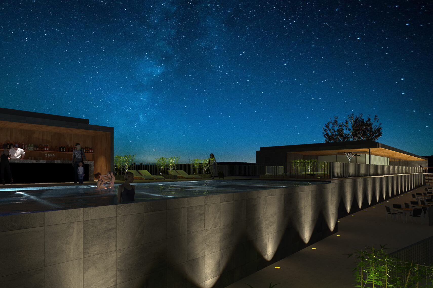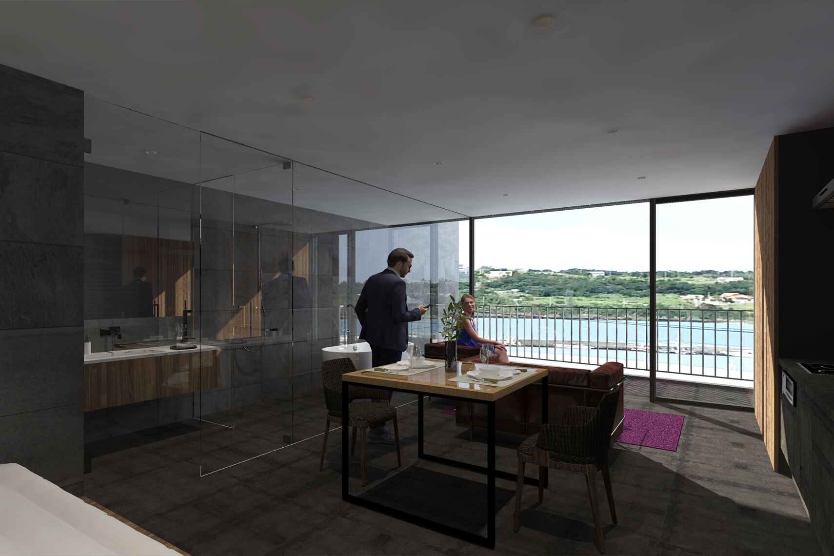 それらをなるべく視界から外すべく、テラスの奥行を斜めにし、瀬底島側のビューを大きく確保するため意識をそちらに向くようなデザインとした。