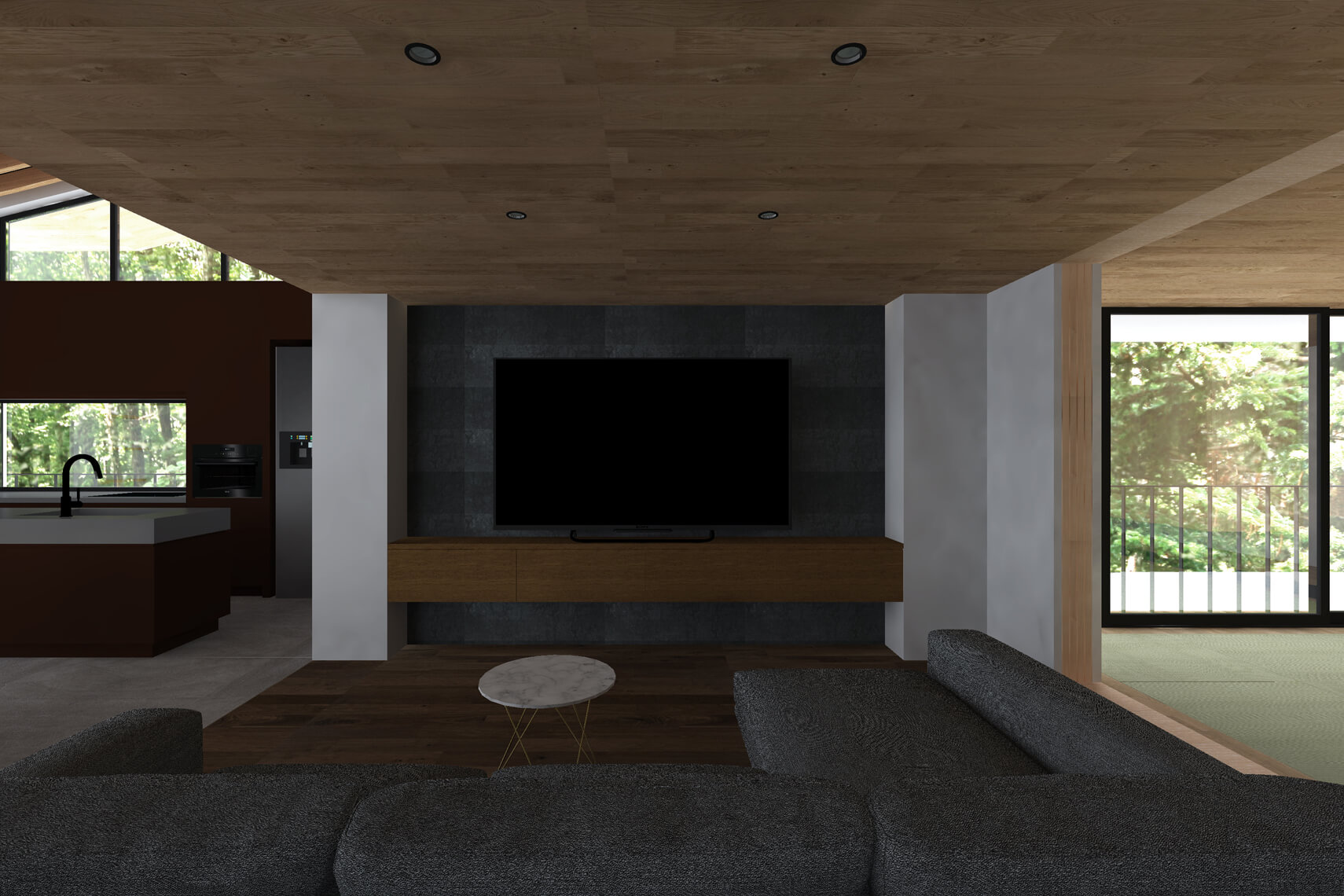 今回の重要な要望である、大きなキッチンとダイニングは、吹抜けのある大空間に鎮座させ、そこでの賑わいは隣にある天井を抑えたリビングや、その奥の和室、または2階のバーカウンターやラウンジを伝って家全体に広がる。