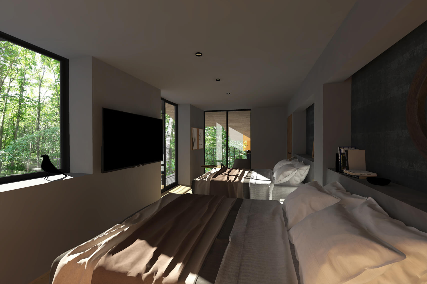 施主が個人利用の想定はなく、保養所としての大人数利用、オフィス利用及びTVドラマ撮影等含めた1棟貸出し等、完全に多用途な事業目的での利用又は収益物件としての利用を想定しているとのことであったため、共有部分では可能な限り間仕切り壁を取り省き、大らかな回遊性あるプランとしたいと考えた。