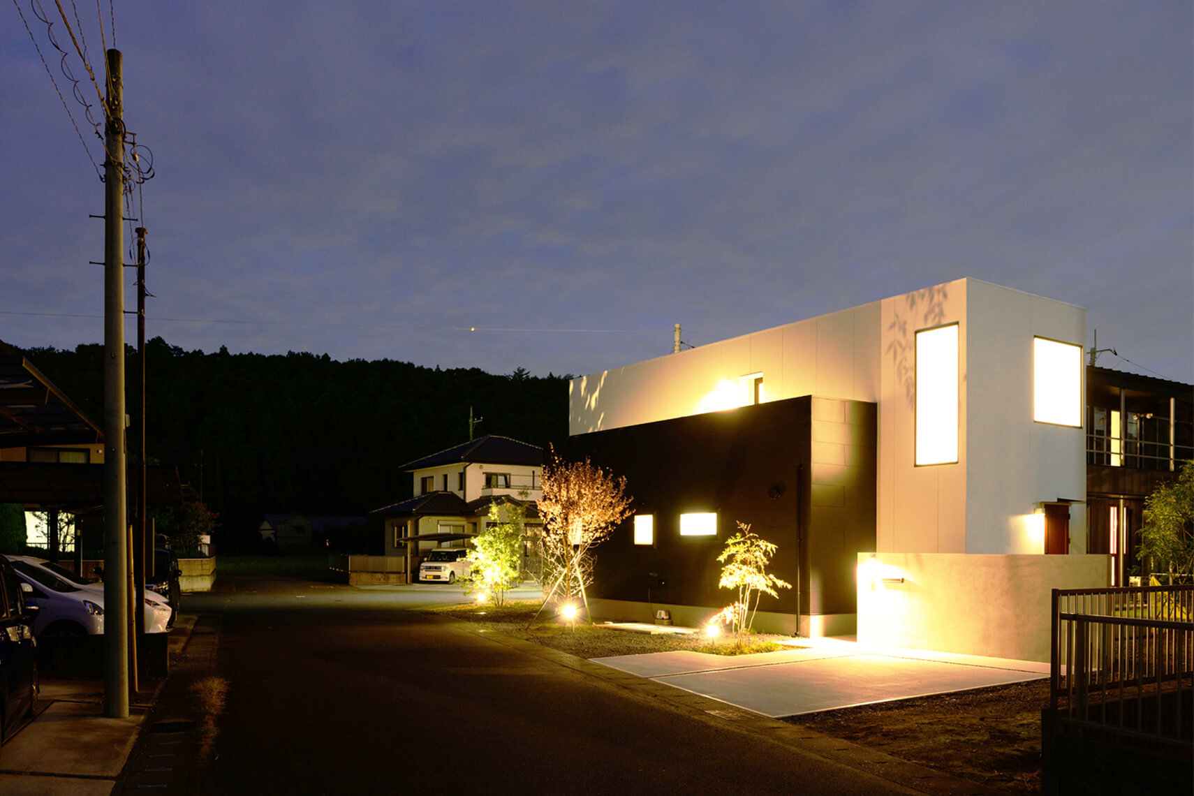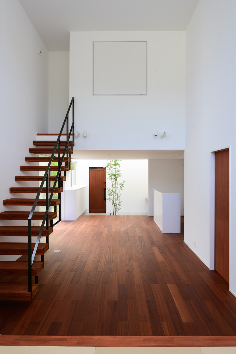 1層の黒いボリュームを水回り、2層の白のボリュームに居室を収めたシンプルな構成で、白い箱の中に、吹抜けが2つある。