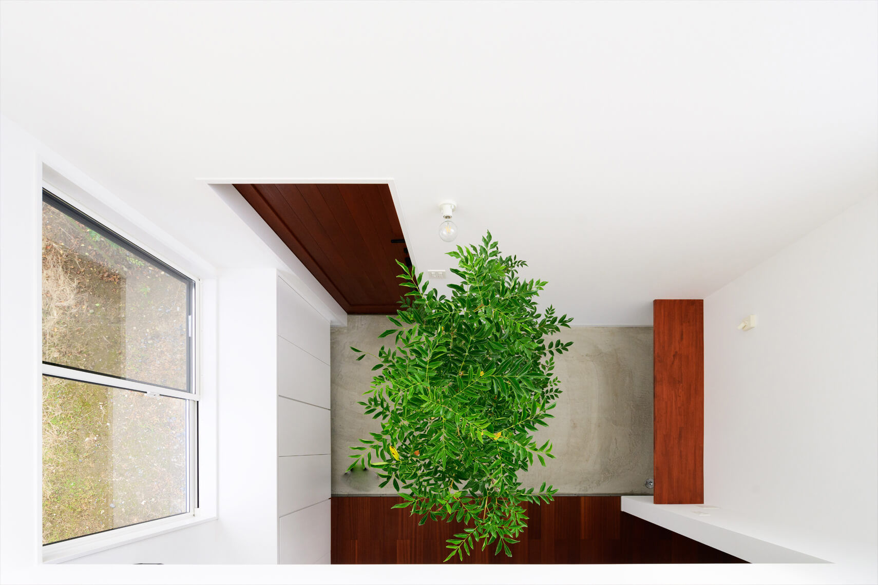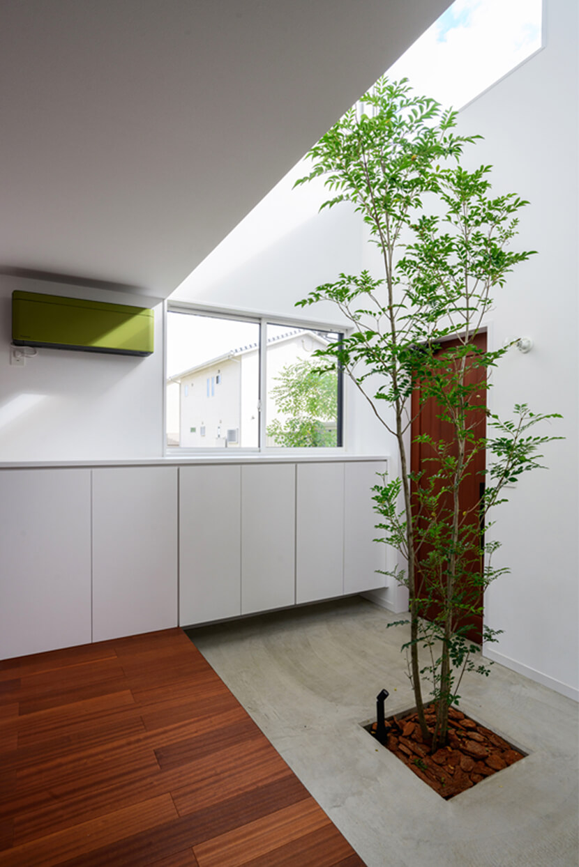 南北に長い敷地で、南側の住宅が境界線に近い為、所謂『南向き』という構成ではなく、家の中に、光の筒のような吹抜けを作ろうと考えた。